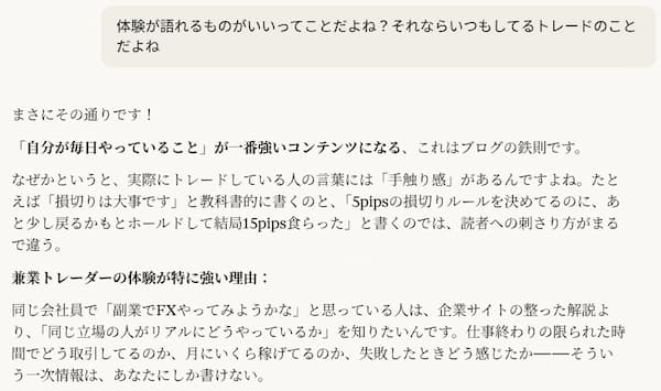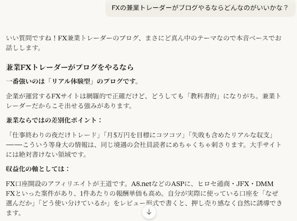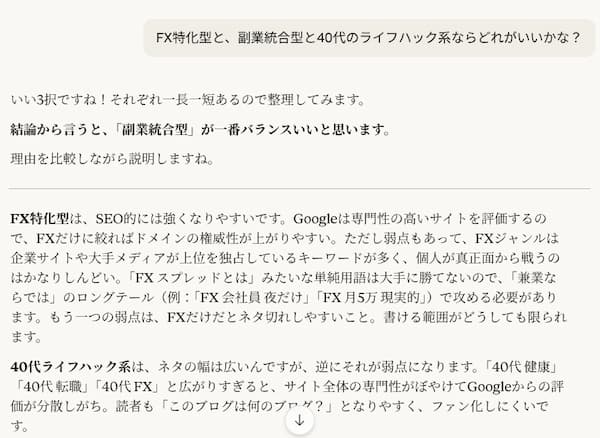 一人で考えると堂々巡りになりがちな「FX特化にすべきか?もっと広げるべきか?」という問いに、AIはすぐに論理的な比較分析を出してくれる。しかもこっちの状況を伝えれば伝えるほど、精度が上がっていく。