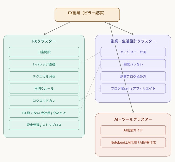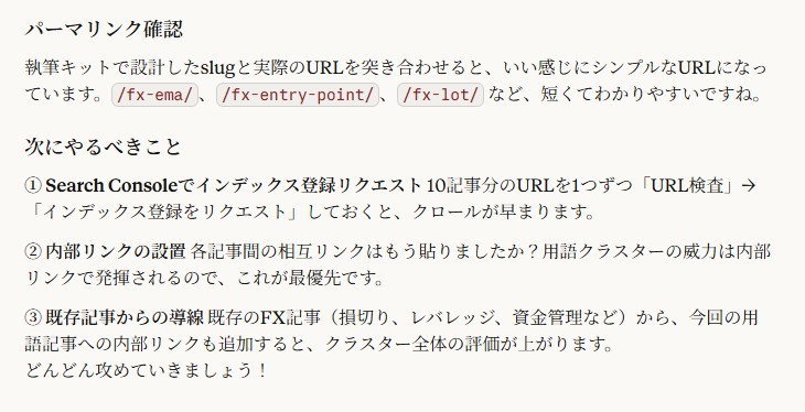引き継ぎファイルがないと、毎回「えーと、前回どこまでやったんだっけ」「FX用語クラスターって何記事あったっけ」とClaudeに説明し直す手間が発生する。引き継ぎファイルがあれば、その時間がゼロになる。