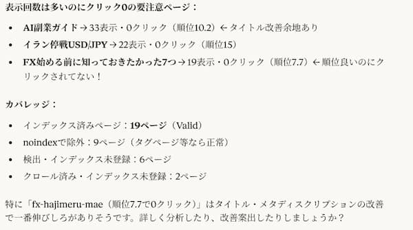これ自体は手動の作業だけど、「どの記事を優先的にインデックス登録すべきか」はClaudeに相談できる。