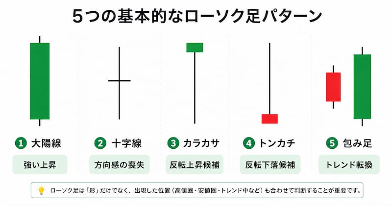 他にも「コマ」「毛抜き天井」「三川明けの明星」など、細かく分類すると全16種類などと呼ばれるパターンがあります。また、2本以上のローソク足を組み合わせて読む手法も数多く存在します。ただし最初の段階では、上記5つのパターンを確実に覚えることを優先してください。「全部覚えてから」より「5つを使いながら感覚を養う」方が、圧倒的に上達は早いです。