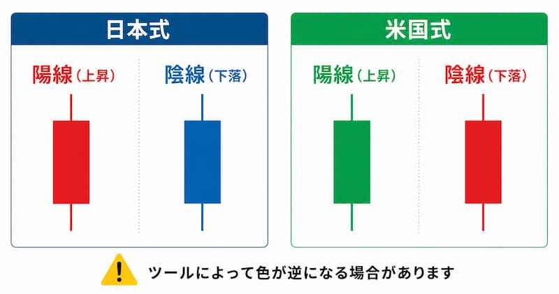 「赤=下落」と思い込んでいると、米国式チャートを見たときに真逆に読んでしまうので注意が必要です。チャートを開いたら、まず「どちらが陽線か」を確認する癖をつけましょう。