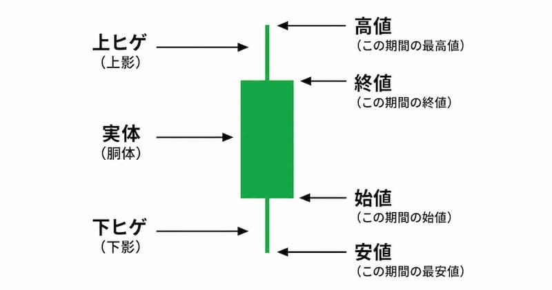 ローソク足の最大の特徴は、1本のローソクに「始値・高値・安値・終値」の4つの価格情報が詰まっている点です。この4つを「四本値(よんほんね)」と呼びます。