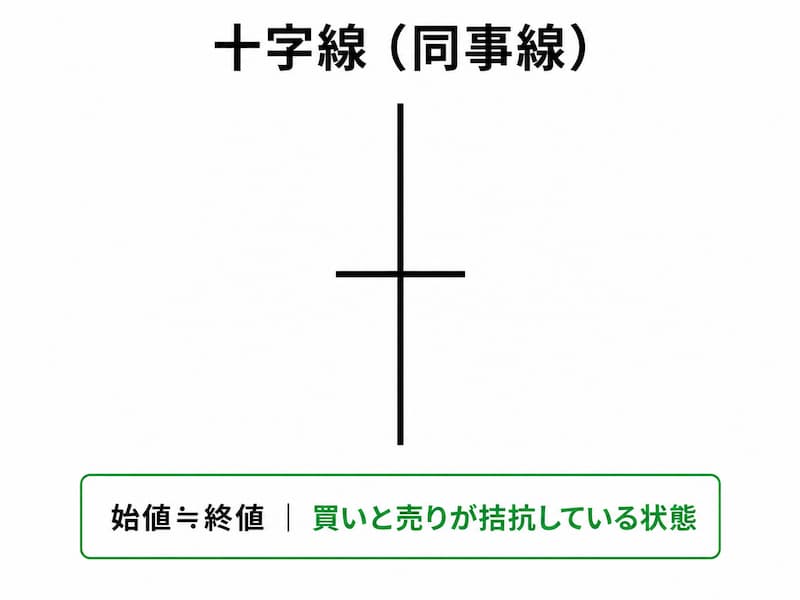 始値と終値がほぼ同じで、実体がほぼゼロに近いローソク足を十字線(同事線・十字足)と呼びます。