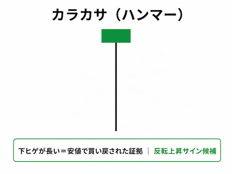 「安値まで下落したが、そこから強く買い戻された」ことを意味します。下落が続いた後の安値圏でカラカサが出ると、反転上昇のサイン候補として注目されます。
