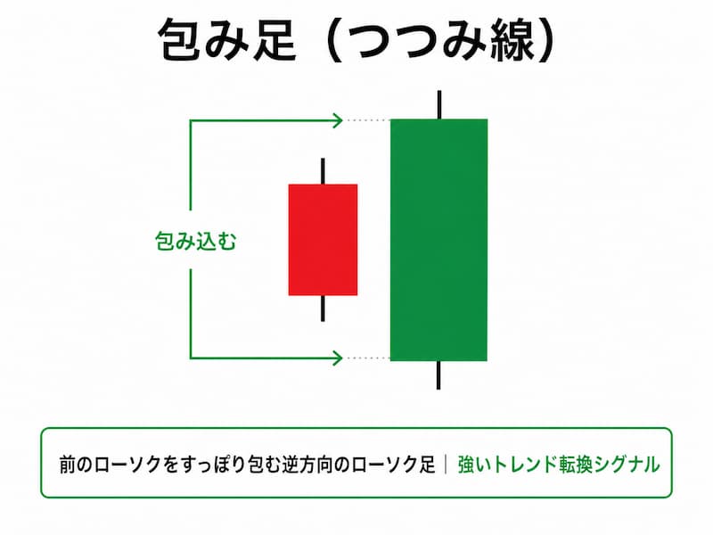 • 下落中に「大きな陽線が前の陰線を包む」→ 強い反転上昇サイン