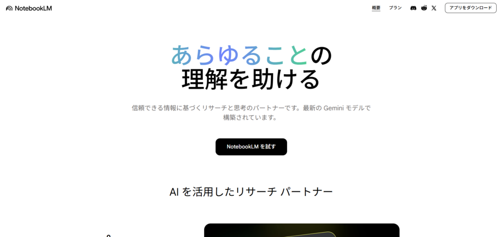 これが初期画面。真ん中のNotebookLMを試すをクリック