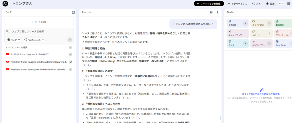 まずはNotebookLMにホワイトハウスの動画を1本入れてみるところから、試してみてください。